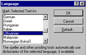 - Tools meniu pasirinkite komandą Language; kalbų sąraše Mark Selected Text As pasirinkite reikšmę Lithuanian (lietuvių kalba) ir po to spragtelėkite mygtuką OK.